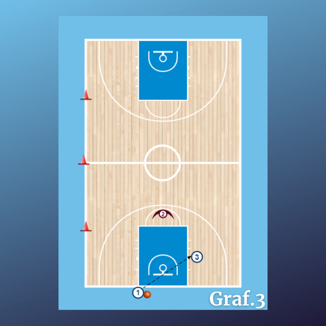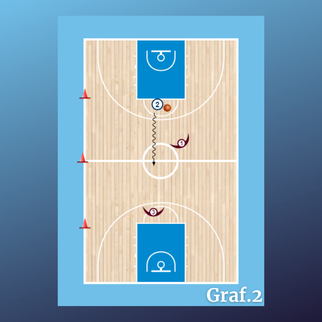 • Cuando el jugador/a con balón llegue al centro del campo deberá decidir a quién de los otros dos le pasa el balón. Graf.1.