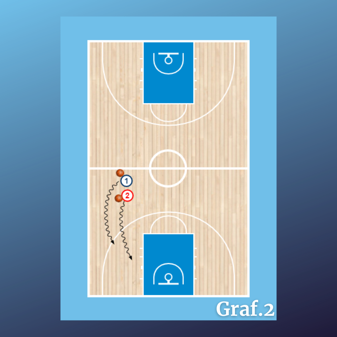 • Jugador/a 1 mirando hacia canasta y jugador/a 2 espalda a canasta.