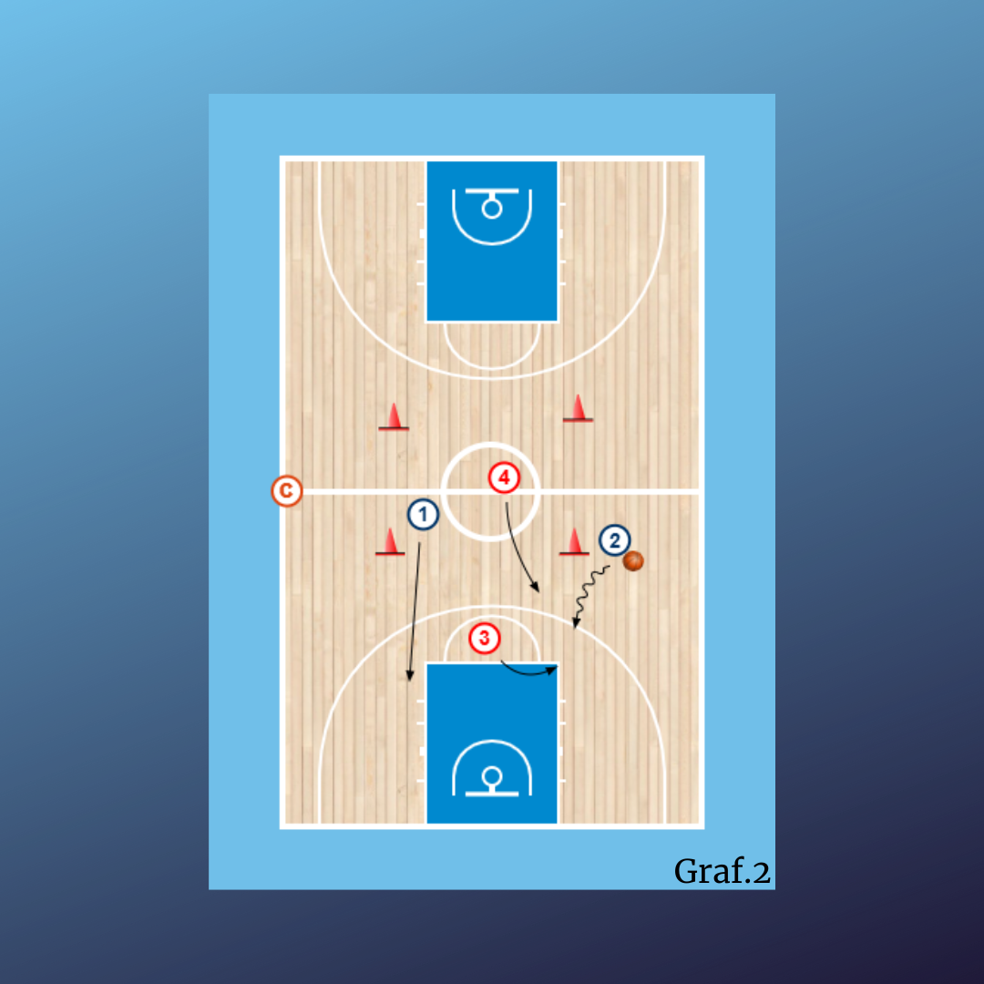 • Jugador/a que recibe balón ataca con su compañero, en este caso 2 y 1 atacan contra 3 y 4 pero el jugador/a que está delante del jugador que recibe el balón debe de tocar el cono que tiene delante para poder defender.