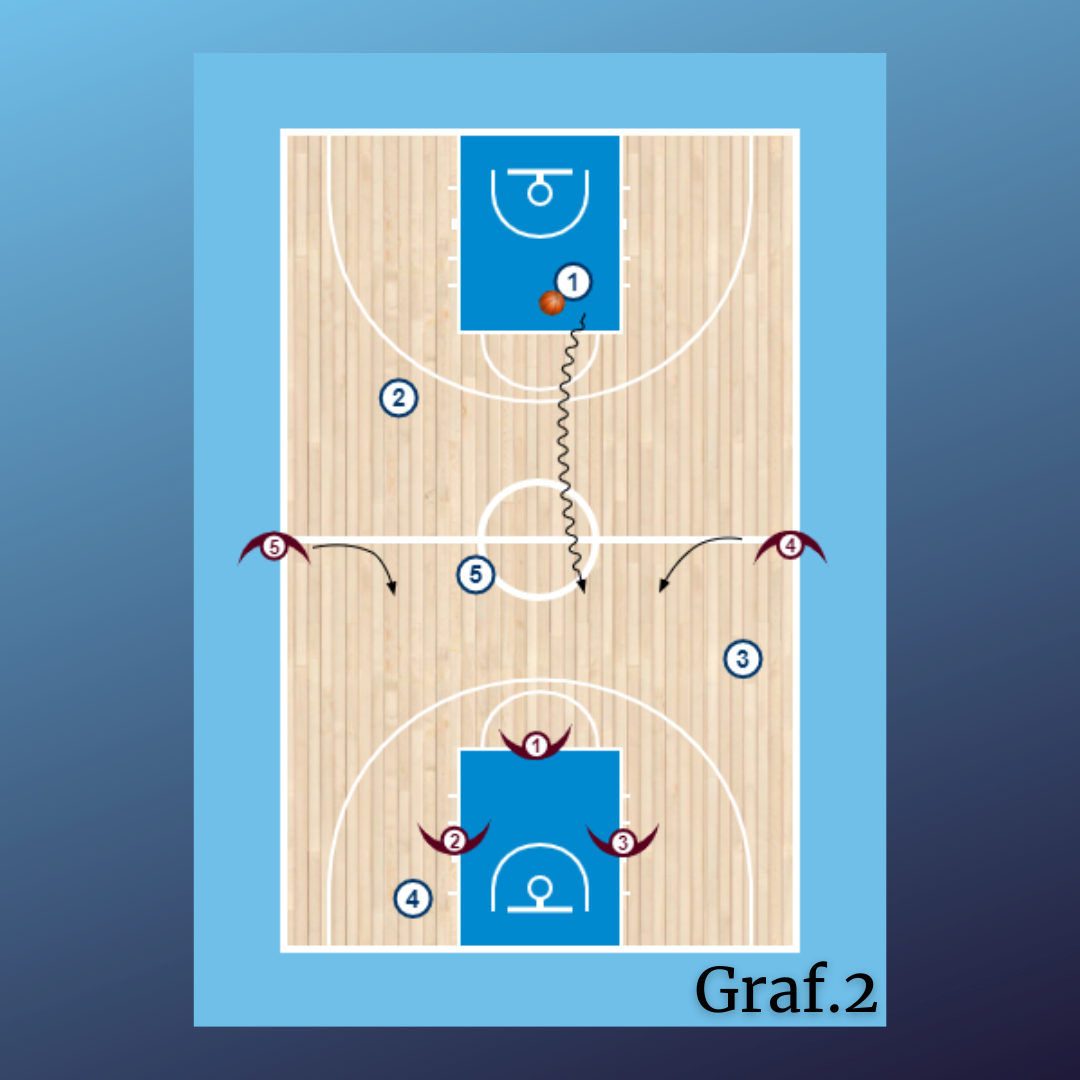 • Cuando el balón cruza la línea de medio campo los 2 jugadores/as que esperan fuera del campo, entran a defender pero previamente deben chocar manos en el círculo de medio campo. (Graf.2)