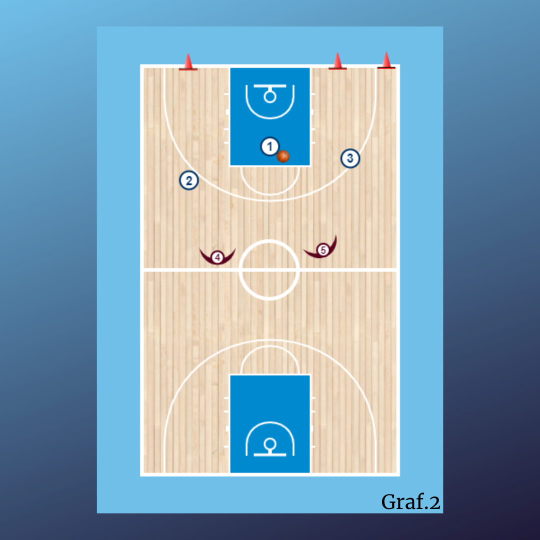 • El jugador/a 1 anota y se abrirá a la banda para recibir un pase del jugador/a 2, que le habrá seguido para capturar el rebote y sacar de fondo.