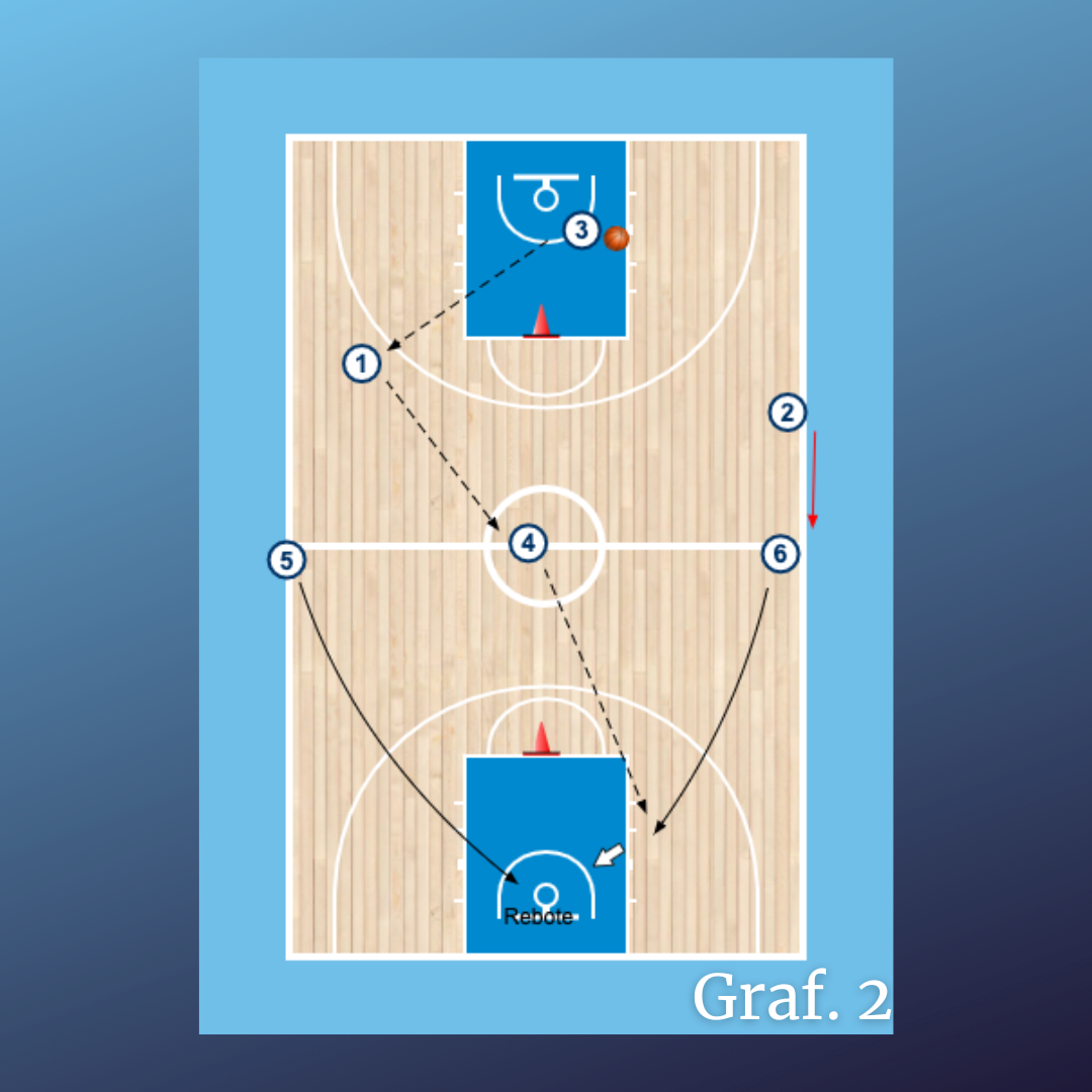 • Jugador/a 3 coge el rebote y pasa a jugador/a 1 que va a la banda para recibir el primer pase de salida.