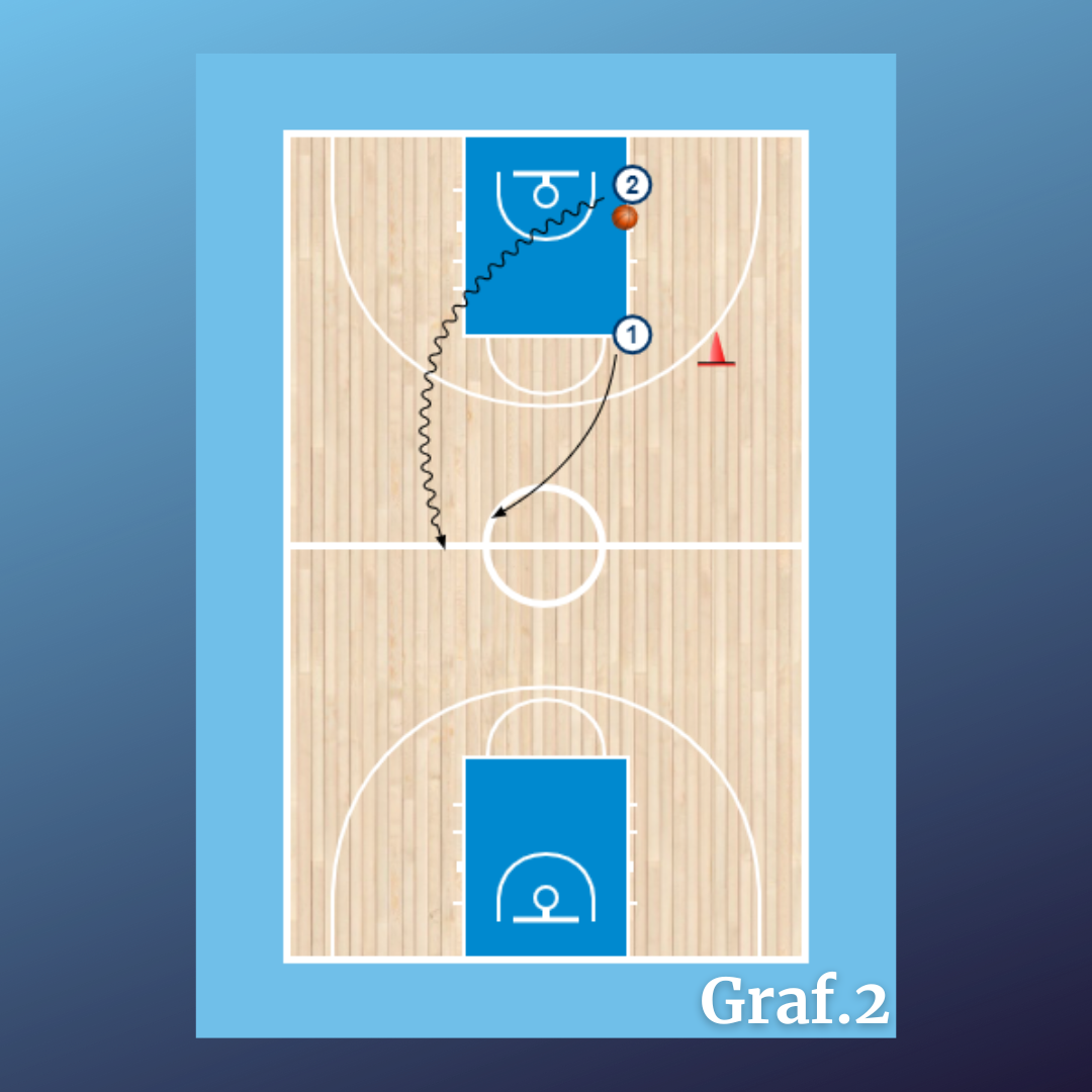 • Jugador/a 2 rebotea y se realiza 1x1 hacia la otra canasta.